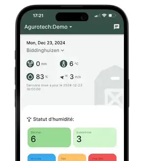 Toutes les données et les informations provenant des capteurs d’humidité du sol, des stations météorologiques et des capteurs de culture d’Agurotech sont partagées via une seule et même application Agurotech. Vous disposez ainsi de toutes les données pertinentes en un seul endroit. L’application Agurotech est disponible pour Android, iOS et en tant qu’application web.