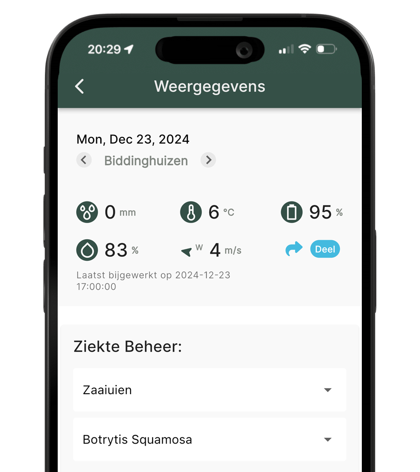 - Real-time en voorspelde plantziektedruk voor selecte gewassen inclusief een spuitplanner